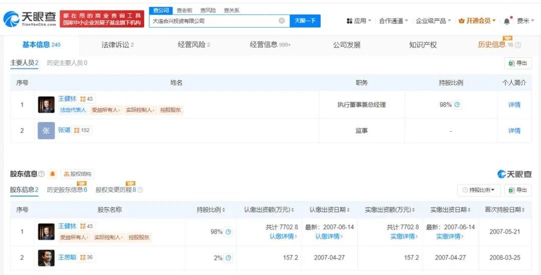 该公司成立于2007年4月,法定代表人为王健林,注册资本7860万,经营范围为项目投资、投资咨询管理、经济信息咨询,由王健林、王思聪分别持股98%、2%。
