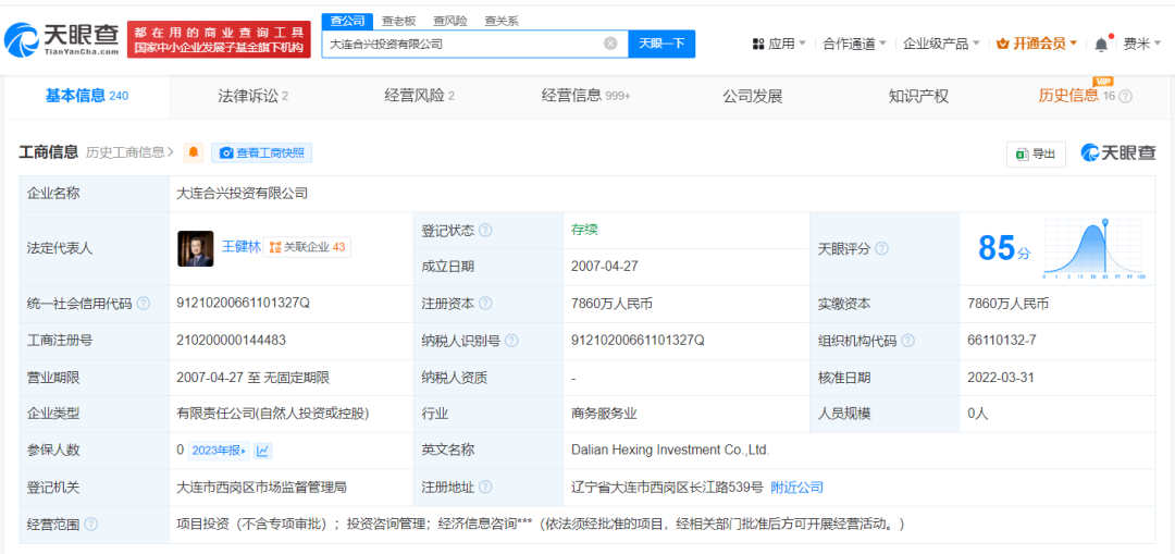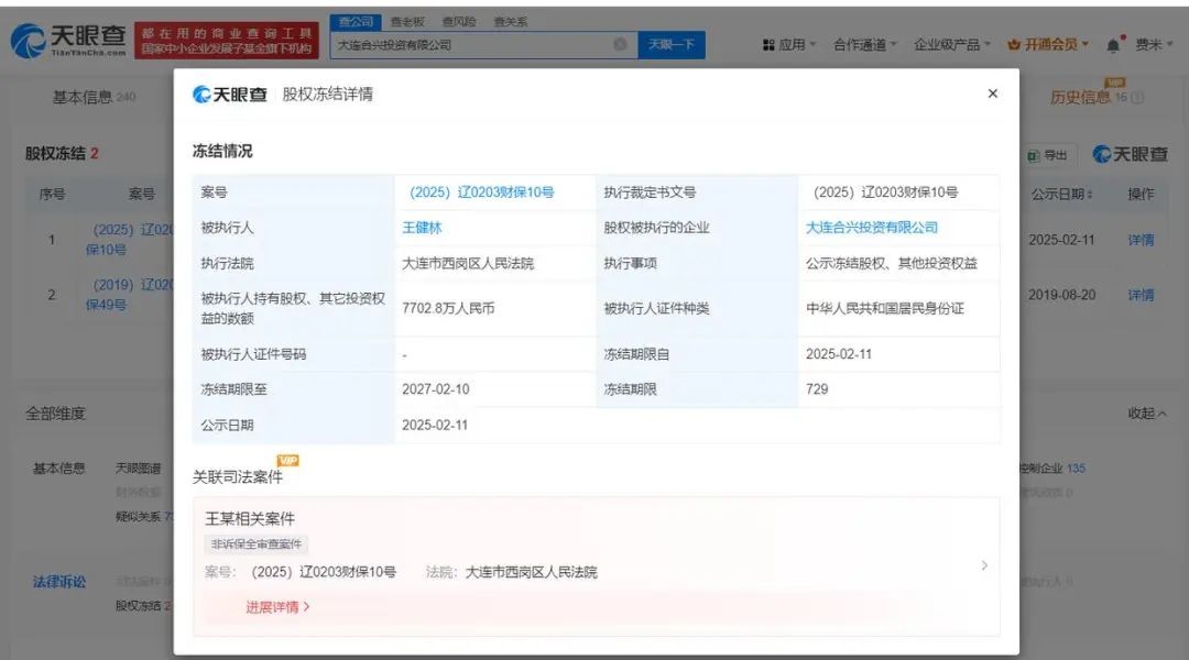 据天眼查爱配资正规吗,近日,由王健林、王思聪共同持股的大连合兴投资有限公司,新增一则股权冻结信息,被执行人为王健林,冻结股权数额7702.8万元,股权被执行的企业为该公司,冻结期限自2025年2月11日至2027年2月10日,执行法院为大连市西岗区人民法院。